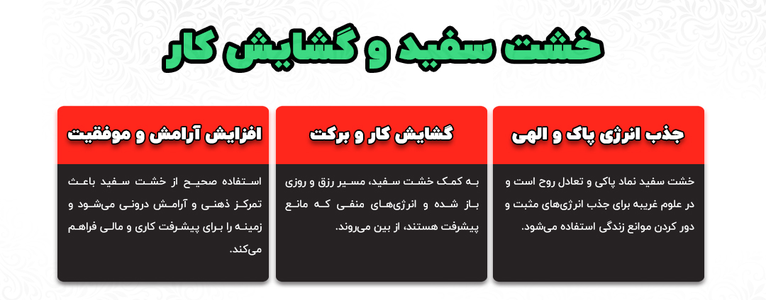 خشت سفید طلسمی است پاک و قوی برای دور کردن بلا و مشکلات. همچنین با دعای گشایش کار و طلسمهای مخصوص، مشکلات کاری و کسبوکار شما رفع شده و رونق و موفقیت به سوی شما خواهد آمد.
